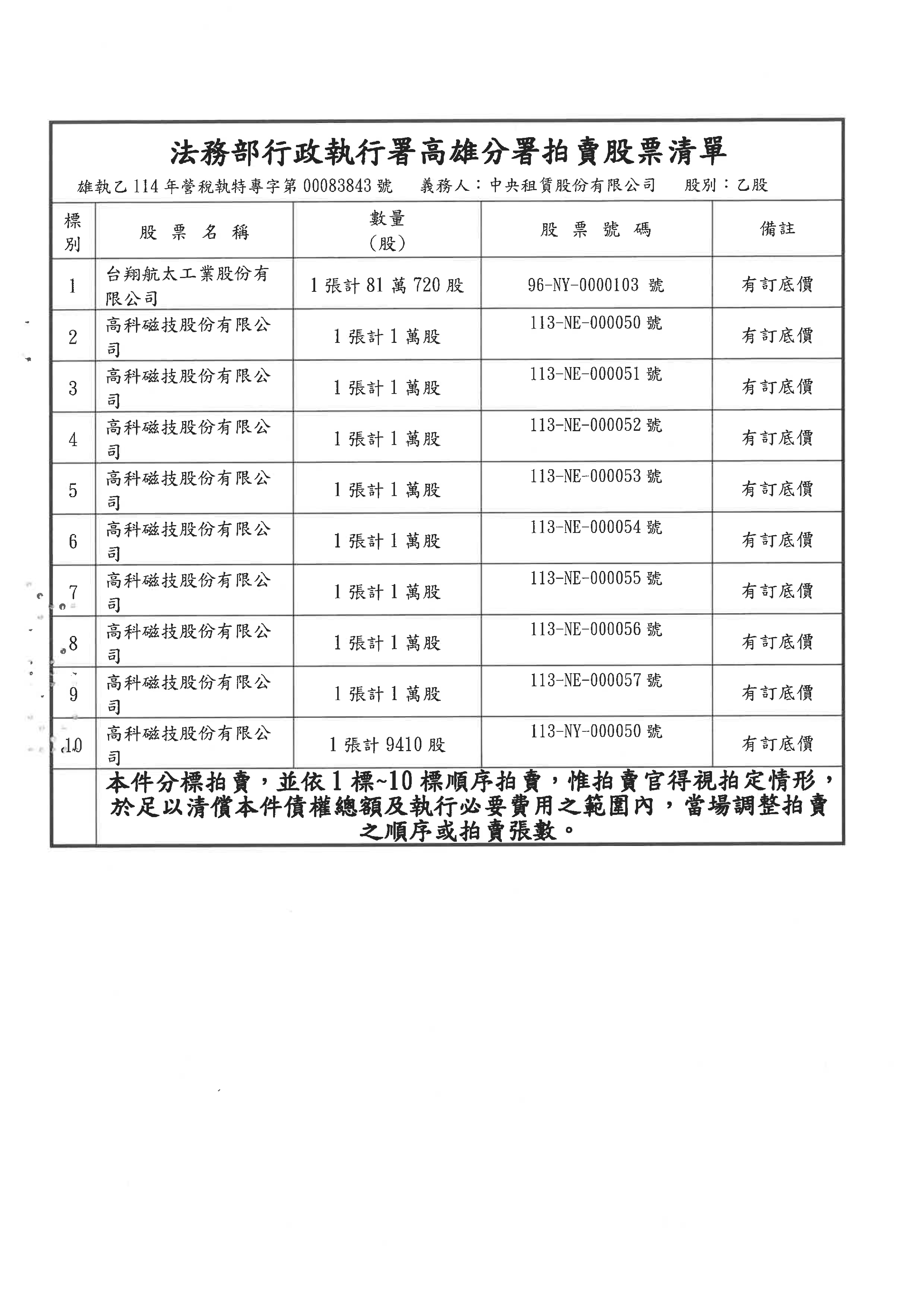 本分署114年度營稅執特專字第8384號拍賣義務人中央租賃股份有限公司所持台翔航太工業股份有限公司及高科磁技股份有限公司股票一事,因移送機關聲請,暫停拍賣。